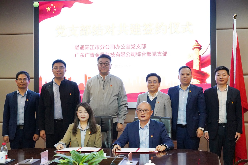 12月7日,广东广青金属科技有限公司综合部党支部与中国联通阳江市分公司办公室党支部在公司办公楼一楼会议室举行了党支部结对共建签约仪式。公司党委书记、董事长王骏,中国联通阳江市分公司党委书记、总经理沈宏平以及双方共建党支部班子成员和党员代表参加了签约仪式。
