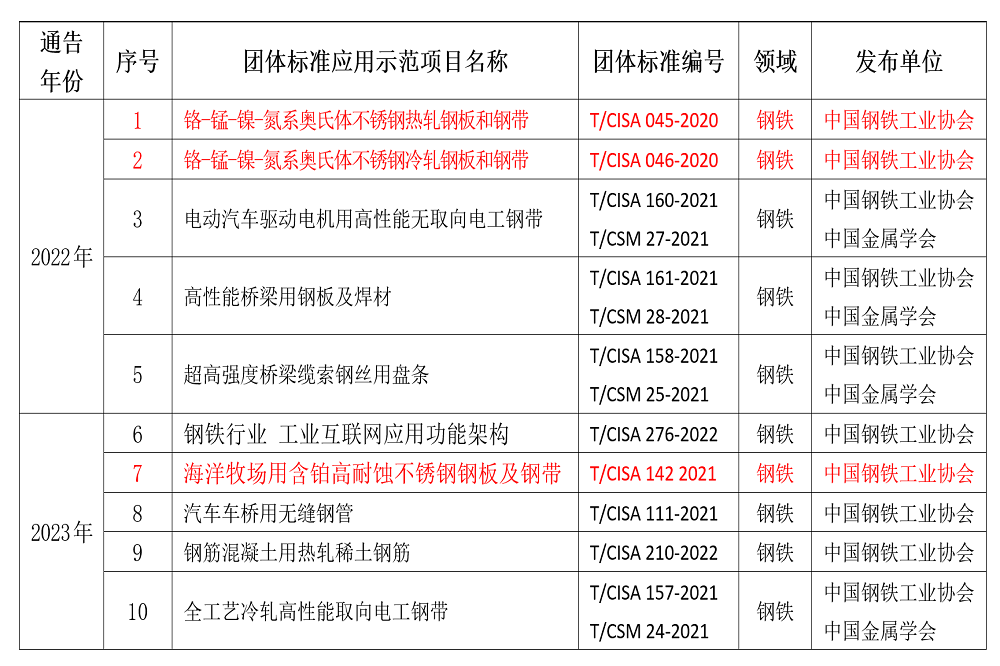 为深入贯彻落实《国家标准化发展纲要》,大力发展团体标准,推进团体标准应用示范,自2022年开始工信部每年评选百项团体标准应用示范项目。两年以来中国钢铁工业协会共有10项团体标准入选,其中青拓集团有限公司和冶金工业信息标准研究院等单位联合编制有关QN系列不锈钢产品的标准有三项,占比达30%,在工信部百项团体标准入选项目数上处于行业领先水平。这三项标准分别是T/CISA 045-2020《铬-锰-镍-氮系奥氏体不锈钢热轧钢板和钢带》、T/CISA 046-2020《铬-锰-镍-氮系奥氏体不锈钢冷轧钢板和钢带》和T/CISA 142-2021《海洋牧场用含钼高耐蚀不锈钢钢板及钢带》。